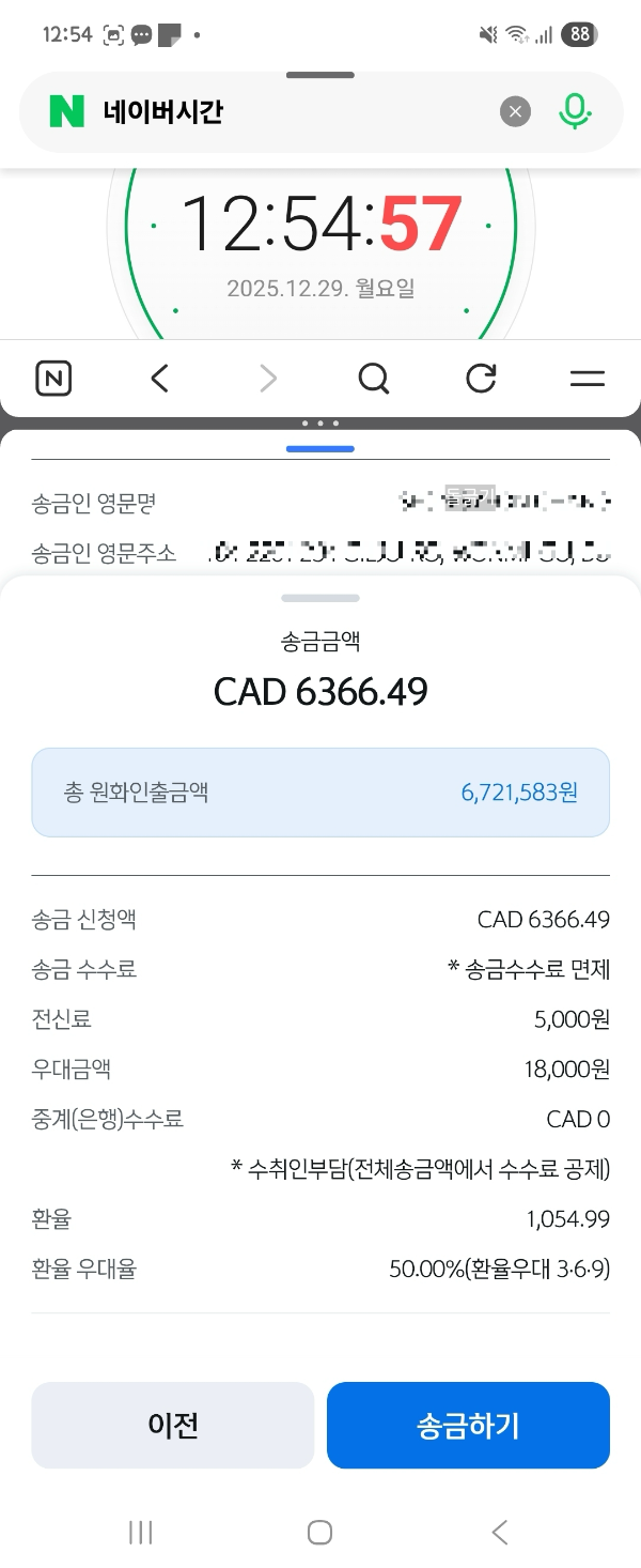 저는 오전 10시 27분에 결제신청을 했고요. 프라이스 매치 신청은 오전 10시 55분에 완료했습니다. 생각보다 오래 걸린 이유는 갤럭시로 화면 분할해서 캡처를 했는데, 제가 분할화면 사이즈만 조절해도 은행 어플 송금화면이 모두 리셋되었기 때문입니다 ^^.. 저는 환율 비교를 위해 신한은행 사용했습니다. 신한은행을 사용한 이유는 제가 캐나다 초기 해외 송금(학자금이나 생활비)을 신한은행 통해서 했기 때문입니다. 본인이 사용하는 (우대를 가장 높게 받을 수 있는) 은행을 사용하시면 됩니다.